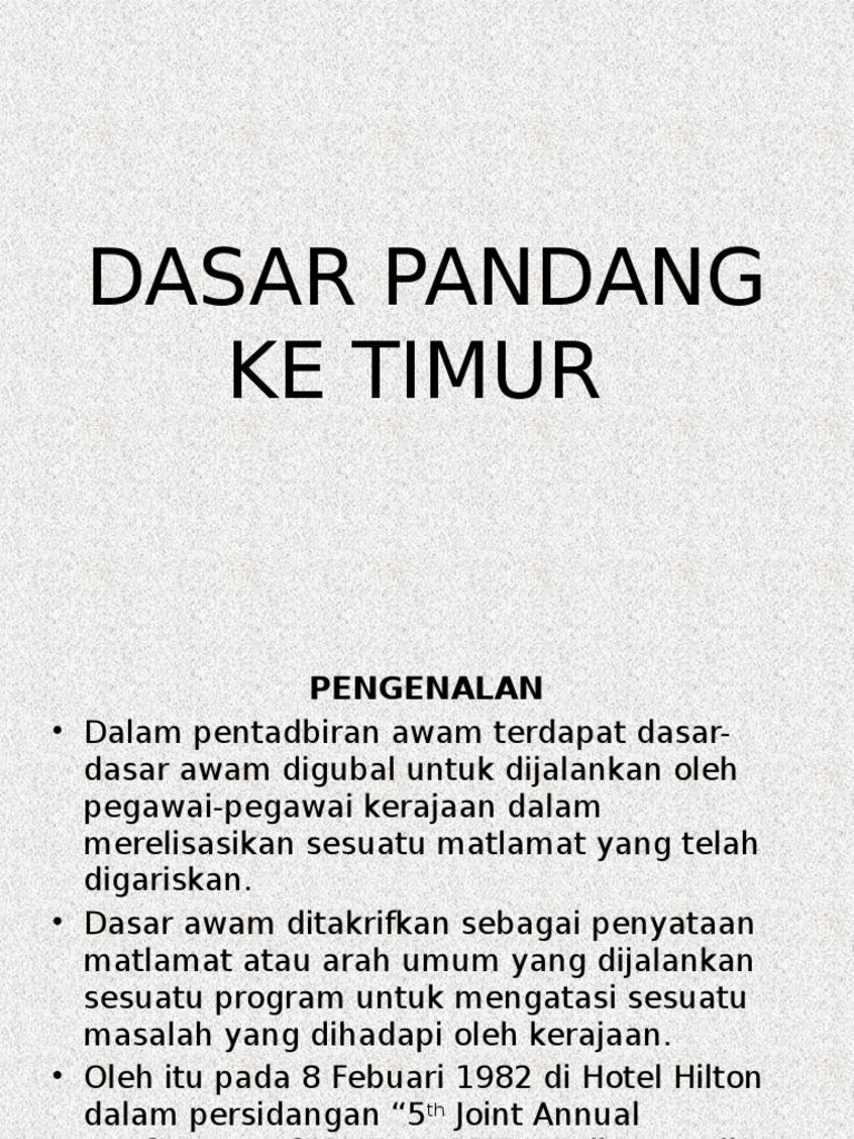 Dasar Pandang Ke Timur from image.slidesharecdn.com Dasar pandang ke timurlatarbelakangdasar pandang ke timur ini telah diumumkan oleh y.a.b. Nur angriani binti nurja yang menyuruh kami membuat blog ini yang bertajuk dasar pandang ke timur.yang terakhir,setinggi penghargaan kepada kementerian pendidikan malaysia yang menyediakan rujukan iaitu buku. Dasar pandang ke timur merupakan dasar ekonomi yang dilancarkan oleh perdana menteri malaysia, tun dr mahathir mohamad pada 8 februari 1982. Maziram production 60 views2 weeks ago. Perdana menteri dato ` seri dr. Penerangan dari azhar dan jumsartika. Dasar pandang ke timur memperlihatkan beberapa perubahan struktur dalam organisasi perkhidmatan awam, termasuk penggunaan kad perakam waktu bagi lebih mendisiplinkan pekerja menepati waktu bekerja. To view this page ensure that adobe flash player version 10.0.0 or greater is installed.